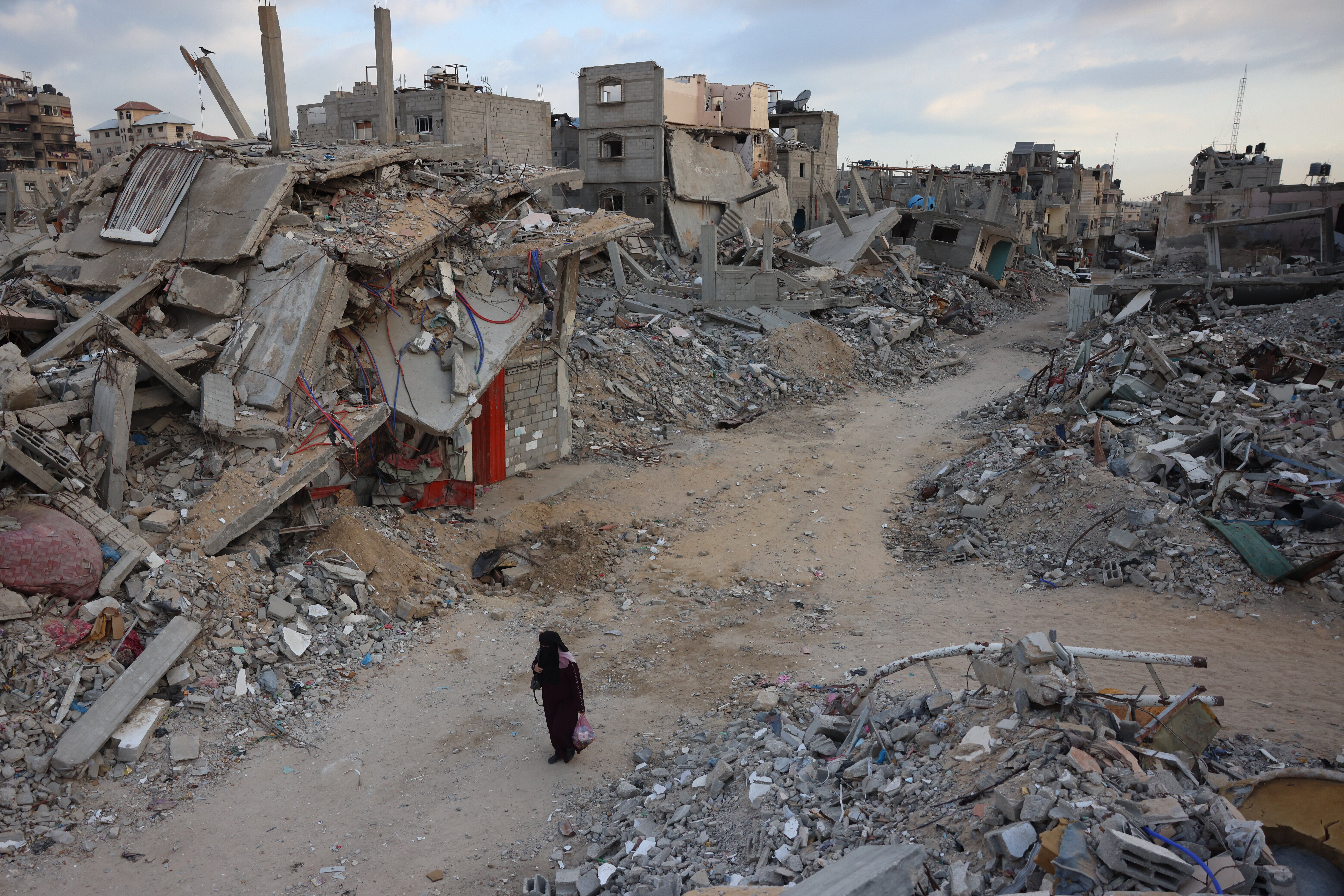 Жінка проходить повз зруйновані будівлі в Хан-Юнісі на півдні Сектора Газа 17 жовтня 2024 року, на тлі триваючої війни між Ізраїлем і палестинським бойовим угрупованням ХАМАС на обложеній палестинській території. (Фото BASHAR TALEB/AFP через Getty Images)BASHAR TALEB через Getty Images