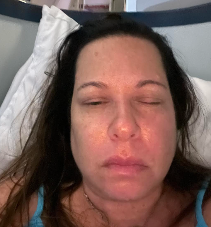 “Це взято на політ додому з сімейної відпустки у 2022 році, який я був змушений закінчити раніше, тому що моє ліве око та щелепа заплющилися”, – пише автор. Надано Алексом Хенкіним Хартом<стор.>Це був на рідкість прекрасний день у Сіетлі навесні 2002 року, і я кидався у футбол з хлопцями на роботі. Напевно, я не мала робити це в спідниці та на підборах, тому що в мене був зламаний палець, розтягнення зап’ястя та пошкодження обертальної манжети.