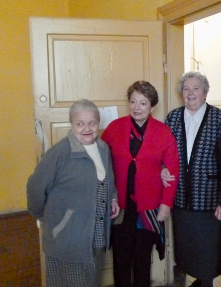 Мама автора (у центрі), сестра Гонората (ліворуч) ), а сестра Зофія відвідує стару будівлю притулку в Польщі. З дозволу Карен Кірстен<стор.>Після обіду мама вибігає на вулицю. Я ледве встигаю за нею.