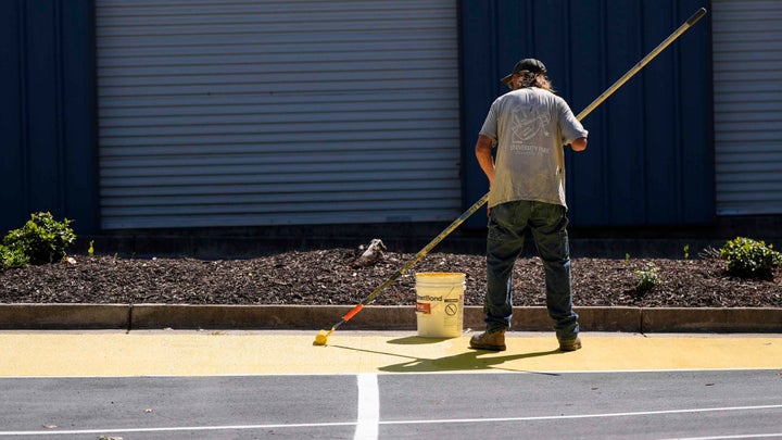 Ронні Джеффріс фарбує автостоянку в Школі науки, мистецтва та підприємництва, щоб охолодити її, зробивши її більш світловідбиваючою, середа, 4 вересня 2024 р., у Мейблтоні, Джорджія (AP Photo/Mike Stewart) через Associated Press